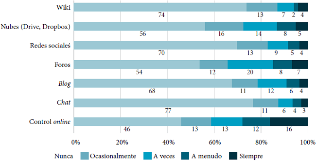En esta misma gráfica, respecto al uso de herramientas de elaboración de textos colaborativos como Google Docs (Google Drive) o Word Online (Dropbox), 70.2 por ciento declaró utilizarlo a menudo, y 65.4 por ciento coincidió en que estos recursos son un aporte a su trabajo en la universidad. Cabe destacar que el uso de este tipo de plataformas está aumentando exponencialmente (Brescó y Verdú, 2014) en la escritura universitaria debido a sus innumerables ventajas, como la ruptura de las barreras del espacio, las variadas herramientas de edición disponibles y la posibilidad de recuperar versiones antiguas.
