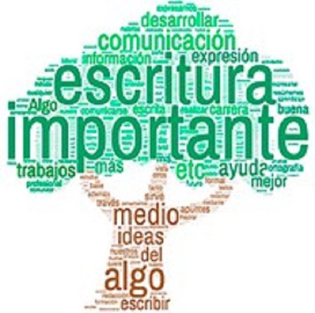 Para este punto, los estudiantes de la muestra debieron definir el concepto de escritura. Con el fin de recuperar las ideas principales indicadas en sus respuestas se extrajeron las unidades lingüísticas con contenido (sustantivos, pronombres, verbos y adjetivos) que usaron para definir la escritura; después se utilizó la herramienta tecnológica disponible en el sitio web www.nubedepalabras.es para representar gráficamente las unidades más recurrentes (Fig. 1):