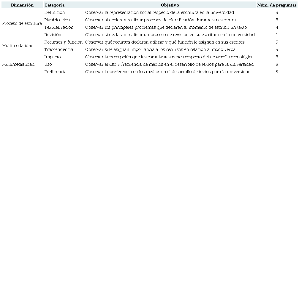 Cada dimensión de la encuesta se subdividió en categorías y para cada una de ellas se estableció un objetivo y se formularon las preguntas específicas asociadas a cada nivel. Así, en la dimensión de proceso de escritura se definieron cuatro categorías: definición, planificación, textualización y revisión; en multimodalidad se definieron dos: recursos y función, y trascendencia; y, por último, en la dimensión multimedialidad se establecieron tres: impacto, uso y preferencia (Tabla 1).