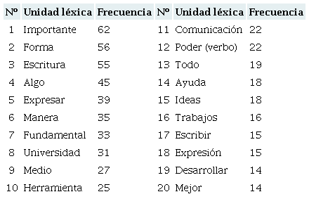 Lo anterior también se ve reflejado en la Tabla 2, donde se muestran las 20 unidades léxicas de contenido que fueron utilizadas más veces por los estudiantes en sus respuestas sobre qué es la escritura universitaria, y que fueron obtenidas a través del análisis del programa AntConc. Este software muestra todas las palabras que se incorporaron en las respuestas para posteriormente, de forma manual, seleccionar sólo aquéllas que son de contenido.