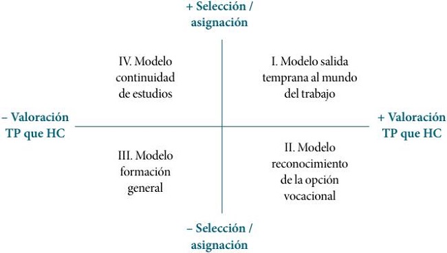 El modelo no selectivo de formación general (cuadrante III) representa una variante escasamente representada en la realidad empírica. Esto porque, en sentido estricto, una mayor valoración de la opción académica conducente a la continuidad de estudios superiores estaría asociada, necesariamente, a algún tipo de mecanismo de asignación o selección de los estudiantes, según lo reflejan las orientaciones valóricas predominantes en el sistema educativo chileno de los últimos años.