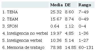 Los resultados se presentan en dos partes. En primer lugar se exponen los estadísticos descriptivos de los puntajes obtenidos en las pruebas de habilidades numéricas (TENA y TEAM), SFON, inteligencia verbal y no verbal, y memoria de trabajo. Y, a continuación, se abordan las dos preguntas de investigación.