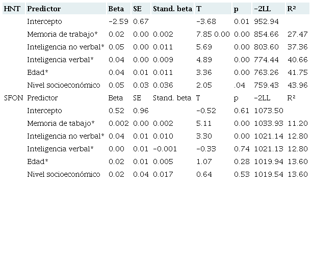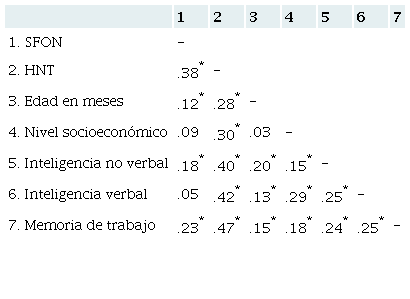 Por otro lado, en la Tabla 3 se puede apreciar que tanto la memoria de trabajo como la inteligencia no verbal contribuyen al desarrollo del SFON de los niños; sin embargo, una vez controladas dichas variables, así como la inteligencia verbal y la edad, se observa que el nivel socioeconómico no contribuye al desarrollo del SFON. Este resultado era previsible en vista de la ausencia de correlación, observada en la Tabla 2, entre el nivel socioeconómico y el SFON.