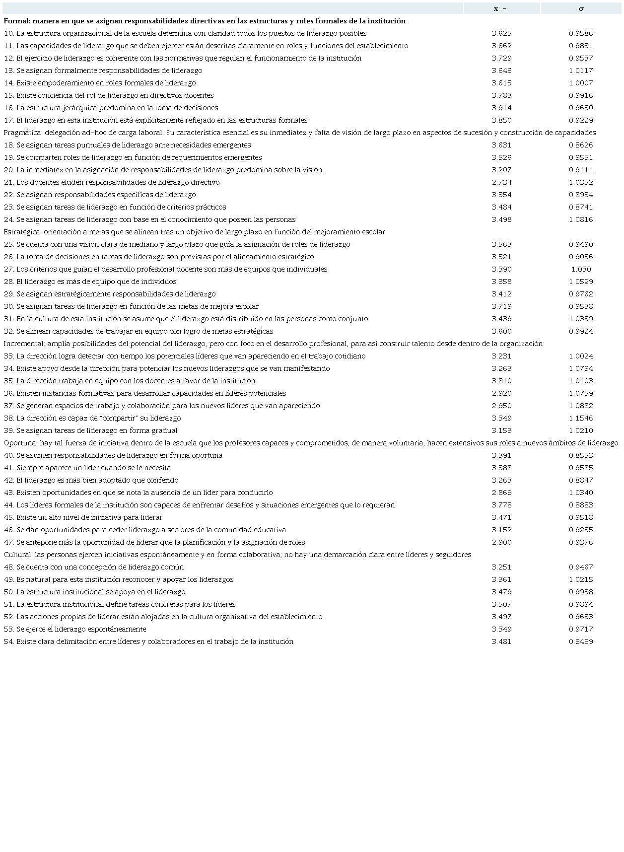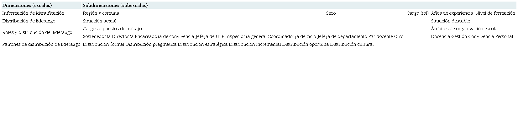 Con base en las perspectivas teóricas predominantes sobre la distribución del liderazgo provistas por organismos internacionales como la OCDE (Pont et al., 2009), y presentes en concepciones más pertinentes usadas en investigaciones, se estructuró un diseño basado en dimensiones a través de diferentes escalas que representaran -y que fueran consistentes- con las definiciones de distribución del liderazgo, considerando que los destinatarios de dicho instrumento son profesores y directivos docentes de escuelas primarias de Chile.