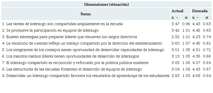 Entre cada una de las dimensiones de la escala existen diferencias absolutas en torno a la media aritmética de sus ítems y el grado de dispersión. Asimismo, los ítems de ambas escalas poseen medias aritméticas cuyos valores varían para la dimensión actual entre 2.3 y 3.8, en tanto que para la dimensión deseada se ubican entre 4.2 y 4.6. Esto refleja una brecha importante en la percepción de la distribución del liderazgo actual y la deseada. Quizá lo más significativo de este análisis descriptivo es la diferencia de percepción; ésta se da al comparar el tercer ítem, cuya diferencia es de 2 puntos, y que se refiere a la indagación sobre si existen estrategias para preparar líderes que renueven los cargos directivos.