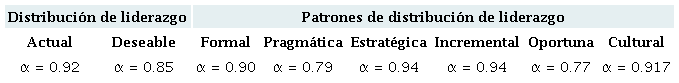 De manera similar al anterior apartado se realizaron los AFE de las escalas asociadas a la distribución del liderazgo, y se detectó, para cada una de las escalas formal, incremental, estratégica y cultural, un solo factor que explica aproximadamente 60 por ciento de la varianza. En cambio, en las escalas pragmática y oportuna emergen dos factores que explican en ambas alrededor de 65 por ciento de la varianza. Respecto de los ítems de cada una de las escalas, sólo el ítem 16 de la subescala de distribución formal posee un valor bajo en comunalidad (0.238), menor que 0.5 y tendiente a 0.