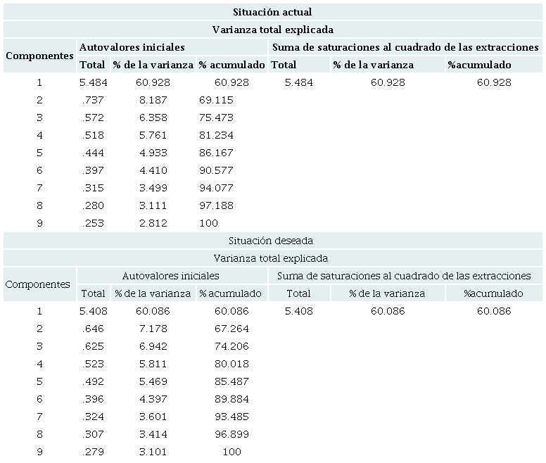 En ambas dimensiones de las escalas emerge un solo factor y éste explica alrededor del 60 por ciento de la varianza. Sin embargo, respecto a los ítems de la escala, sólo el 9 presenta un valor bajo de 0.403 en comunalidad, y junto al análisis de su contenido, respecto de los otros, se puede interpretar como un aspecto diferente a lo que pretende medir la dimensión en su conjunto.