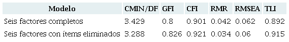 En definitiva, los indicadores de ajuste, absolutos y relativos, se pueden considerar como adecuados para medir los constructos a los cuales están dirigidos, salvo en el caso del primer modelo, donde se deben considerar los factores 1 y 2 como relacionados y donde los indicadores de ajuste son buenos casi en su totalidad (salvo el caso de RMSEA). En el caso de la escala de las seis dimensiones, los indicadores son todos muy apropiados para el uso potencial que pueda tener la escala, salvo por la posibilidad de eliminar los ítems antes señalados, lo cual conduciría a la obtención de un modelo con un ajuste muy superior, pero a costa de la eliminación de reactivos que pueden incidir en la evaluación de la validez del contenido o en la confiabilidad del test.