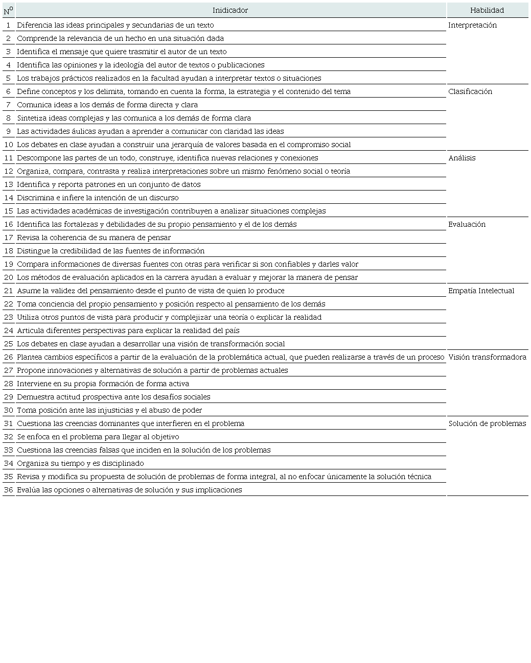 El instrumento de medición de las habilidades cognitivas del pensamiento crítico en los estudiantes fue estructurado a partir de una guía de indicadores (Tabla 1), con cinco opciones de respuesta gradual del tipo escala Likert. Este instrumento fue previamente sometido a una prueba piloto y validado por seis expertos del área.