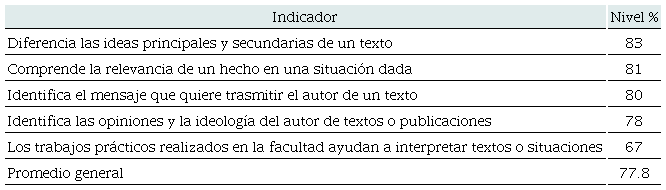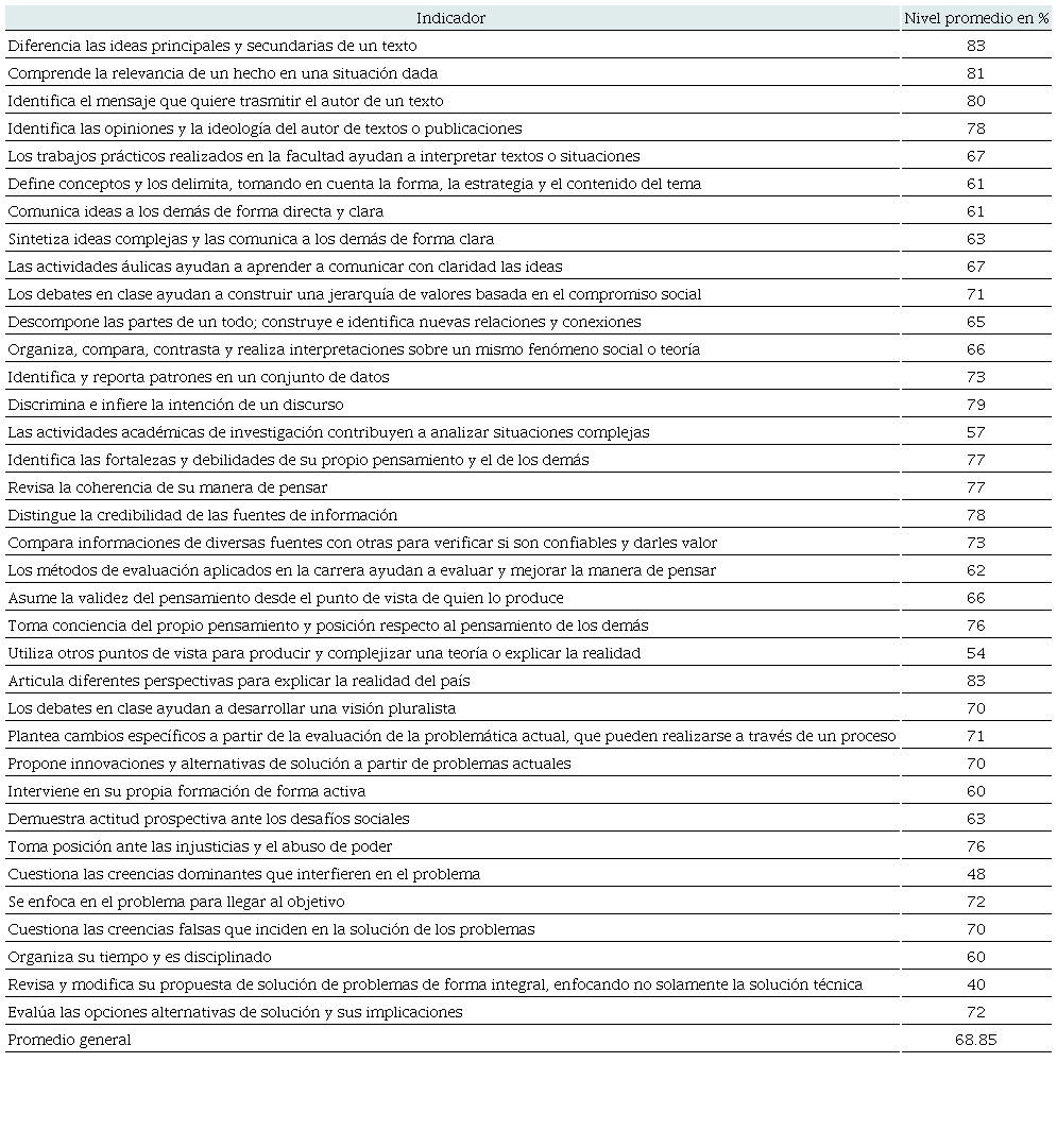 Las diferencias en los resultados de las medias obtenidas para cada uno de los indicadores fueron significativas, ya que alcanzaron 43 por ciento. El menor nivel promedio fue de 40 por ciento, obtenido en el indicador: “revisa y modifica su propuesta de solución de problemas de forma integral, enfocando no solamente la solución técnica”. El nivel más elevado fue de 83 por ciento, en el indicador: “diferencia las ideas principales y secundarias de un texto”, que corresponde al nivel superior de desarrollo. La Tabla 2 presenta los promedios porcentuales obtenidos luego del análisis de los datos recolectados.