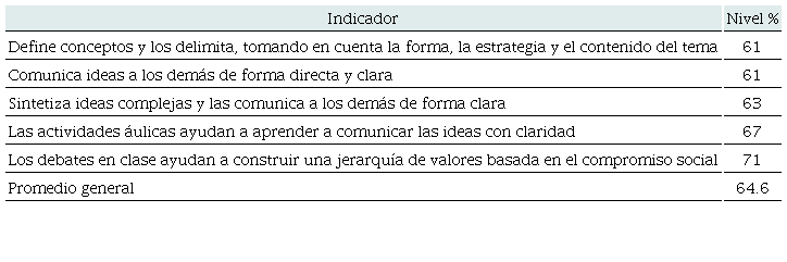 Los promedios más bajos se observan en los indicadores que se refieren a la definición y delimitación de conceptos, y en las habilidades de comunicación, con promedios de 61 por ciento. Los participantes destacaron la contribución de los debates y las actividades áulicas, con promedios de 67 y 71 por ciento, respectivamente.