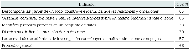 La habilidad cognitiva de análisis obtuvo un promedio de 68 por ciento en la percepción de los participantes. El promedio más elevado se presenta en el indicador “discrimina e infiere la intención de un discurso”, con 79 por ciento, que indica una frecuencia de aplicación elevada (muchas veces), y el más bajo en el indicador “las actividades académicas de investigación contribuyen a analizar situaciones complejas”, con apenas 57 por ciento de frecuencia, que implica una percepción media (a veces). Estos resultados son presentados de forma detallada en la Tabla 5.