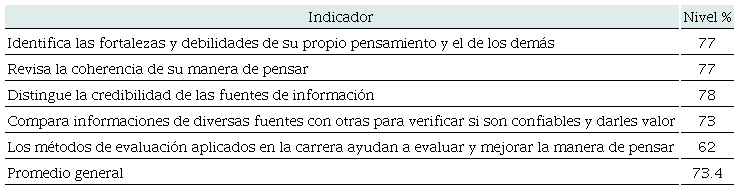 En la habilidad de evaluación se obtuvo un promedio de 73.4 por ciento. Casi todos los indicadores de esta habilidad presentaron niveles superiores a 70 por ciento, lo cual indica una percepción elevada de los participantes en los indicadores de la actividad académica de la carrera. El indicador “los métodos de evaluación aplicados en la carrera ayudan a evaluar y mejorar la manera de pensar” fue el único que tuvo un promedio menor a 70 por ciento en la percepción de los participantes, con un nivel de 62 por ciento. Estos resultados se presentan de forma detallada en la Tabla 6.