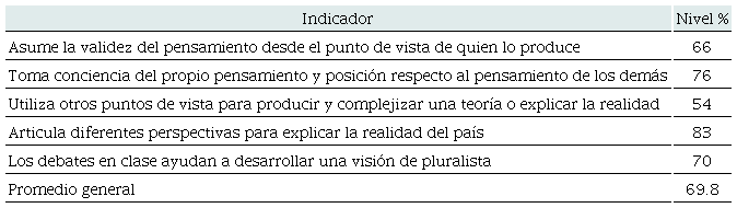 Con relación a la empatía intelectual, la percepción de los estudiantes participantes arrojó un nivel promedio de 69.8 por ciento, equivalente al nivel medio de desarrollo de acuerdo con la escala de niveles establecida en el estudio. El nivel promedio más elevado se obtuvo en la percepción del indicador denominado “articula diferentes perspectivas para explicar la realidad del país”, y el nivel con menor promedio se obtuvo con relación al indicador “utiliza otros puntos de vista para producir y complejizar una teoría o explicar la realidad”, con apenas 54 por ciento. Los porcentajes obtenidos en cada indicador se presentan en la Tabla 7.