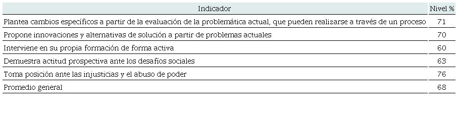 La habilidad visión transformadora tuvo un nivel promedio de desarrollo de 68 por ciento en la percepción de los participantes, que equivale al nivel medio de la escala establecida para este estudio. El mayor promedio del conjunto de indicadores de esta habilidad se presentó en el indicador “toma posición ante las injusticias y el abuso de poder”. El indicador considerado por los participantes en un nivel menor de desarrollo fue: “interviene en su propia formación de forma activa”, con 60 por ciento. Esto podría indicar un nivel reducido de autonomía y participación de los estudiantes en su propia formación profesional. Los resultados obtenidos para cada indicador, de forma porcentual, se presentan en la Tabla 8.