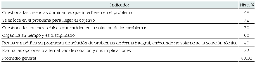 El nivel de desarrollo de la habilidad solución de problemas fue menor al obtenido en las otras habilidades: sólo 60.33 por ciento, si bien con esa cifra se posiciona, como las demás, en un nivel intermedio de desarrollo, de acuerdo con la escala establecida para este estudio. Dos indicadores se destacan por situarse en un nivel menor respecto de los demás: “cuestiona las creencias dominantes que interfieren en el problema”, con 48 por ciento, y “revisa y modifica su propuesta de solución de problemas de forma integral, enfocando no solamente la solución técnica”, con apenas 40 por ciento. Los resultados de la percepción de los alumnos sobre los indicadores de la habilidad cognitiva solución de problemas se presentan por cada indicador en la Tabla 9.