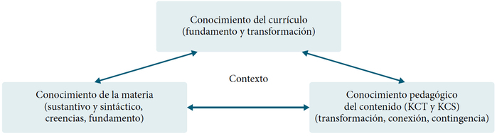 En el centro del modelo se aprecia el contexto, que se refiere a la estructura que define los conocimientos fundamentales para la enseñanza de las matemáticas (Fennema y Franke, 1992). De acuerdo con Petrou y Goulding (2011), el contexto incluye el sistema educativo, los objetivos de la enseñanza de la matemática, el currículo, los materiales didácticos y el sistema de evaluación; también debe considerarse el contexto local, por ejemplo, los recursos materiales, las instalaciones, la ubicación de la escuela, el personal, etc. Al igual que nosotros, Petrou y Goulding (2011) coinciden con Fennema (1992) al indicar que es indispensable conocer el contexto en el que el profesor desarrolla sus actividades para comprender el conocimiento que tiene.