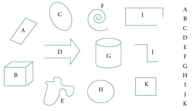 En el reactivo 4 (Figura 2), la selección esperada respecto a las figuras a las que es posible determinar su área eran A, B, C, E, G, H y K, sin embargo, de los 39 sujetos de estudio únicamente ocho seleccionaron las siete figuras; siete sólo omitieron la figura E y seis seleccionaron sólo las figuras bidimensionales. Además de lo ya mencionado, algunas cuestiones destacables son: