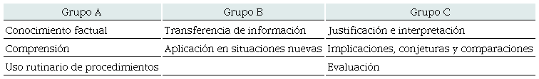 Smith et al. (1996) puntualizan que la jerarquía no se basa en la dificultad del reactivo, sino en la naturaleza de la actividad que debe realizarse. En esta investigación exploramos las tres categorías del grupo A, mismas que, con base en las características proporcionadas por los autores, se describen a continuación:
