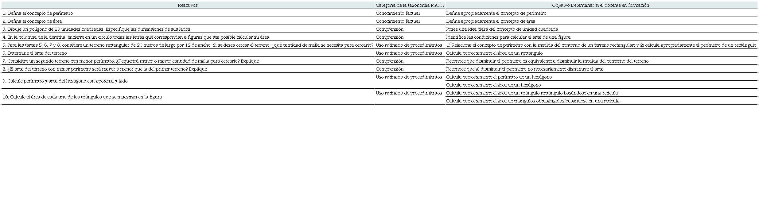 Con base en las explicaciones anteriores, elegimos reactivos considerando su posible contribución para caracterizar el conocimiento sobre perímetro y área de estudiantes de la licenciatura en Educación Primaria. Además de incluir tareas utilizadas en otras investigaciones que estudian el conocimiento de la materia, incorporamos problemas con planteamientos similares a los presentados en libros de texto de educación básica con el propósito de garantizar la cohesión entre el instrumento y el currículo nacional.
