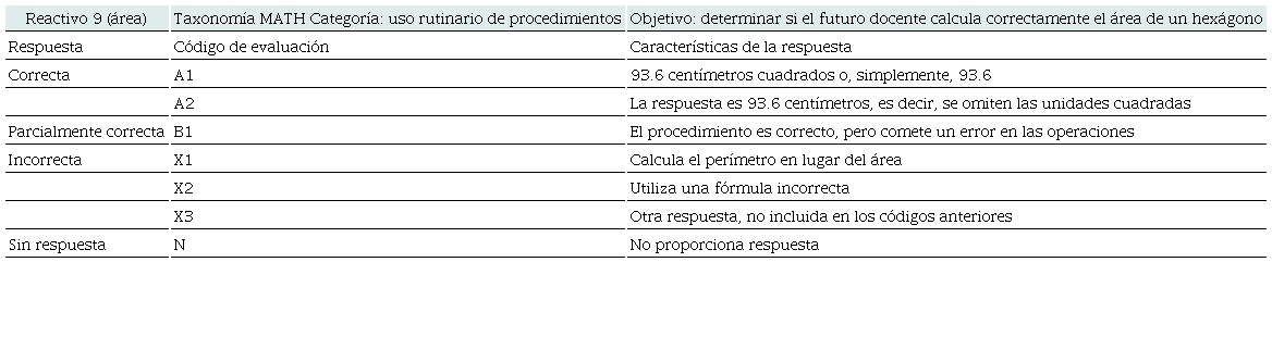 Las respuestas correctas corresponden a códigos que inician con la letra A, las respuestas parcialmente correctas inician con la letra B, las respuestas incorrectas se representan con códigos cuya inicial es X y, en caso de que el estudiante no haya proporcionado respuesta alguna, el código es simplemente N. Por ejemplo, la Tabla 3 corresponde a la tarea de calcular el área de un hexágono regular, planteada en el reactivo 9. En ella se muestran los indicadores para clasificar las respuestas de los sujetos de estudio.