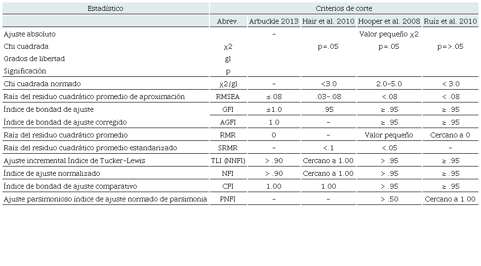 La estimación del modelo puede realizarse mediante dos métodos: el primero es el ajuste exacto, el cual responde a una pregunta dicotómica y se evalúa usando el test chi cuadrada con grados de libertad donde los valores de significación estadística mayores que 0.05 o 0.01 indican que el modelo propuesto se ajusta bien a las varianzas y covarianzas observadas. Por tradición se ha evaluado el ajuste del modelo a partir de la medida de chi cuadrada, sin embargo, se ha documentado, entre otros problemas (Byrne y Van de Vijver, 2010; Hair et al., 2010; Hu y Bentler, 1999), la sensibilidad de éste al tamaño de muestra, por lo que es posible que indique diferencias significativas en modelos que son equivalentes. Aunado a ello, normalmente se utiliza un conjunto de estadísticos de ajuste, puesto que ninguno de ellos aporta la información necesaria para valorar el modelo en su totalidad (Schreiber et al., 2006).