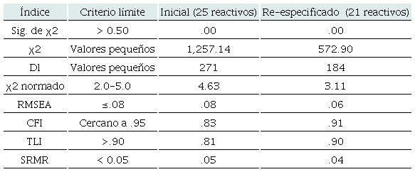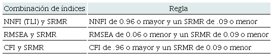 Hu y Bentler (1999) reportaron algunos problemas en la evaluación global del modelo con chi cuadrada y plantearon una valoración de modelos de medición con una estrategia que consiste en combinar criterios de corte de dos índices de bondad de ajuste, como alternativa a los criterios convencionales. El ajuste del modelo se valora con las reglas propuestas, de tal forma que se requiere de un valor de raíz del residuo cuadrático promedio de aproximación (RMSEA por sus siglas en inglés) de .06 o menor, y un valor de raíz del residuo cuadrático promedio estandarizado (SRMR por sus siglas en inglés) de .09 o menor para considerar un modelo con buen ajuste. En la Tabla 2 se muestra esta propuesta.