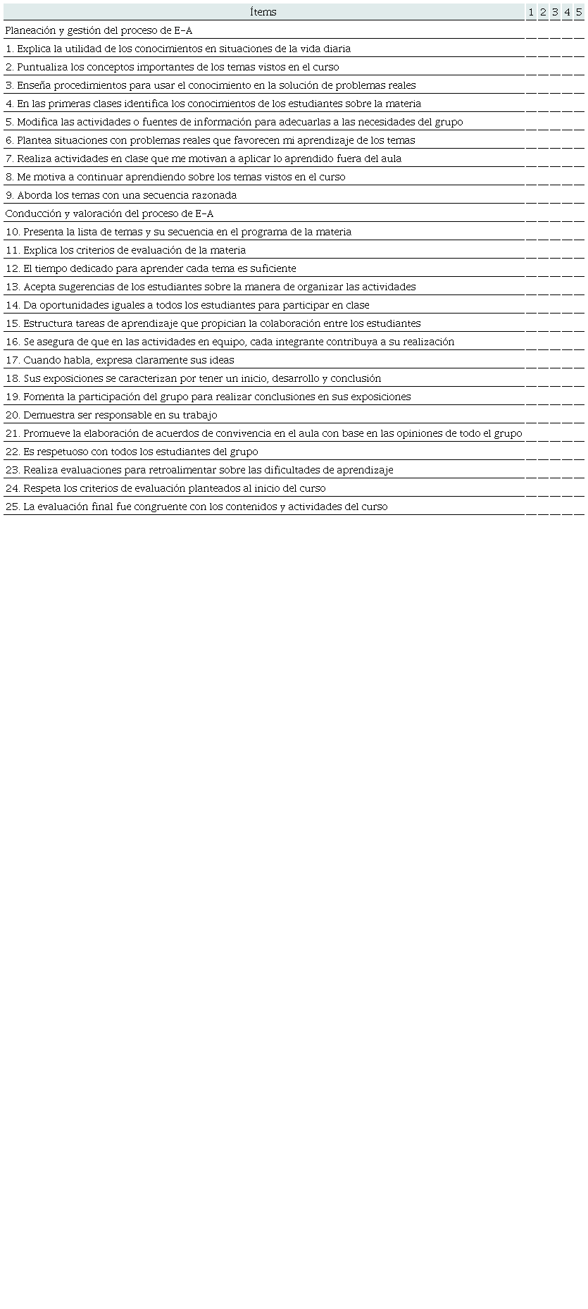 Cabe señalar que la teoría sobre la enseñanza que sustenta a la mayoría de los cuestionarios de evaluación docente por los alumnos considera que la enseñanza efectiva es multidimensional, por lo que se propone evaluar las diferentes dimensiones que la conforman. Por lo general, la agrupación de los reactivos es producto de los análisis factoriales exploratorios y/o confirmatorios a los que fueron sometidos los instrumentos, y refleja las dimensiones de la enseñanza a juicio de los estudiantes (Boysen, 2016). Además, a partir de los estudios de correlación entre los puntajes de los cuestionarios y el aprovechamiento de los estudiantes las dimensiones asociadas a la efectividad de la enseñanza se han clasificado, en orden de importancia, en: claridad y entendimiento, estimulación del interés por la materia, preparación y organización del curso, logro de los objetivos planteados y motivación a los estudiantes para tener alto rendimiento (Feldman, 2007).