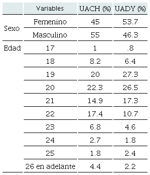 En la Tabla 5 se presentan el sexo y edad de los participantes: 55 por ciento hombres y 45 por ciento mujeres en el caso de la UACH, y 46.3 por ciento hombres y 53.7 por ciento mujeres en el caso de la UADY; =21.09 años para los estudiantes de la UACH y =20.47 años para los de la UADY.
