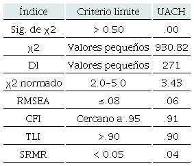 Los resultados relacionados con los tres primeros pasos de la aplicación de esta técnica analítica fueron similares a los encontrados en la muestra de la UACH. En lo relativo a la evaluación del modelo, los valores obtenidos de los diferentes índices de bondad de ajuste RMSEA y SRMR se ubicaron en el límite crítico y el caso de chi cuadrada normado en el rango aceptable. La chi cuadrada, CFI y TLI no registraron valores que confirmen su ajuste, por lo tanto, se optó por realizar la fase de modificación del modelo.