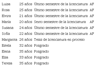 A continuación se presentan los datos correspondientes a la edad y estudios de las entrevistadas, y se identifica con AF a quienes formaban parte del núcleo que daba impulso a los trabajos de la Asamblea Feminista: