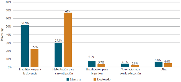 Aunado a esto, en la Gráfica 2 se observa que la mayor parte de los académicos normalistas con doctorado (67 por ciento) ha cursado un programa con orientación hacia la investigación y 51.9 por ciento de los programas de maestría ha tenido una orientación hacia el desarrollo de habilidades vinculadas con la docencia. Un menor porcentaje ha realizado estudios relacionados con la adquisición de competencias afines a la gestión académica e institucional. Además, existe un porcentaje bajo de participantes -en comparación con el resto- que ha cursado posgrados no relacionados con el campo de la educación.