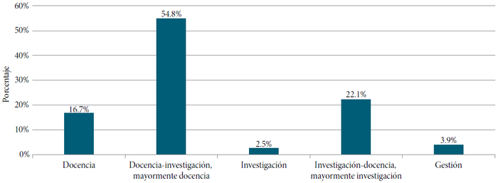 Por otra parte, no sorprende que el mayor porcentaje de participantes refiere una preferencia hacia actividades relacionadas con la "docencia-investigación, pero mayormente docencia" (54.8 por ciento) y un porcentaje bajo prefiere desempeñar sólo "actividades de investigación" (2.5 por ciento) (Gráfica 3). Es notable que sólo 16.7 por ciento opta por la docencia como actividad exclusiva, y que la mayor parte prefiere realizar ambas (docencia e investigación), sumado a que una cuarta parte de los encuestados tiene preferencias orientadas principalmente a la investigación. Estos resultados implican que ha iniciado una tendencia hacia el empoderamiento de la investigación, cuando menos en el nivel simbólico de las preferencias.