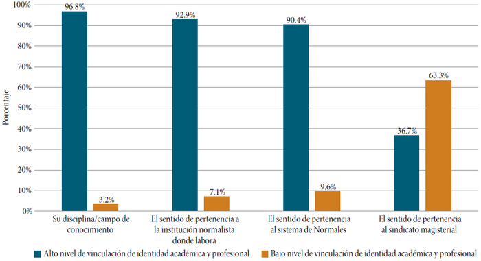 Otro de los resultados describe que los participantes manifiestan una identidad académica que se vincula en gran medida a la noción de formador de formadores y, paralelamente, también se reconocen como docentes-investigadores. Lo anterior se suma a que un alto porcentaje de los participantes indica un sentido de pertenencia al campo disciplinar, a la institución de adscripción y al sistema normalista en general, en orden decreciente.