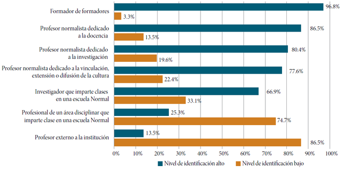 Vinculado a esto, la Gráfica 5 muestra que los participantes asocian su identidad académica, en mayor medida, con la noción de ser un "formador de formadores" y "profesor normalista dedicado a la docencia". Estos datos son predecibles, dado que los objetivos institucionales se encuentran orientados hacia la formación inicial docente, mismos que organizan y orientan las funciones académicas. La identificación de los participantes es influenciada por los sistemas de valores anclados en la pedagogía y demás ciencias de la educación, que constituyen un complejo campo de conocimiento y acción de naturaleza multidisciplinaria (Gargallo, 2002).