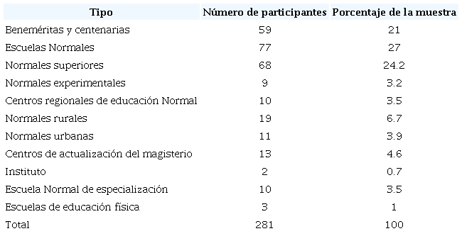 La población objetivo fueron los académicos de las escuelas Normales públicas de México. Los participantes que integraron la muestra son 281 académicos normalistas adscritos a alguno de los diferentes tipos de escuelas Normales a nivel nacional (Tabla 1). Como criterios de inclusión se establecieron: 1) contar con cualquier tipo de contrato laboral durante el ciclo escolar 2019; 2) contar con una antigüedad laboral de al menos dos años en la institución; y 3) encontrarse activo en actividades académicas a nivel de licenciatura o posgrado. Estos criterios aseguran un participante con condiciones laborales que le permiten tener una perspectiva definida respecto de lo que se buscaba indagar a través del cuestionario.