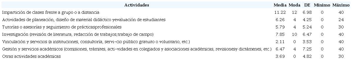 De acuerdo con los datos reportados por los participantes, la carga horaria dirigida a las actividades afines a la docencia predomina como las de mayor dedicación de tiempo a la semana. En contraste, las actividades relacionadas con la vinculación y servicios son las de menor dedicación (Tabla 2).