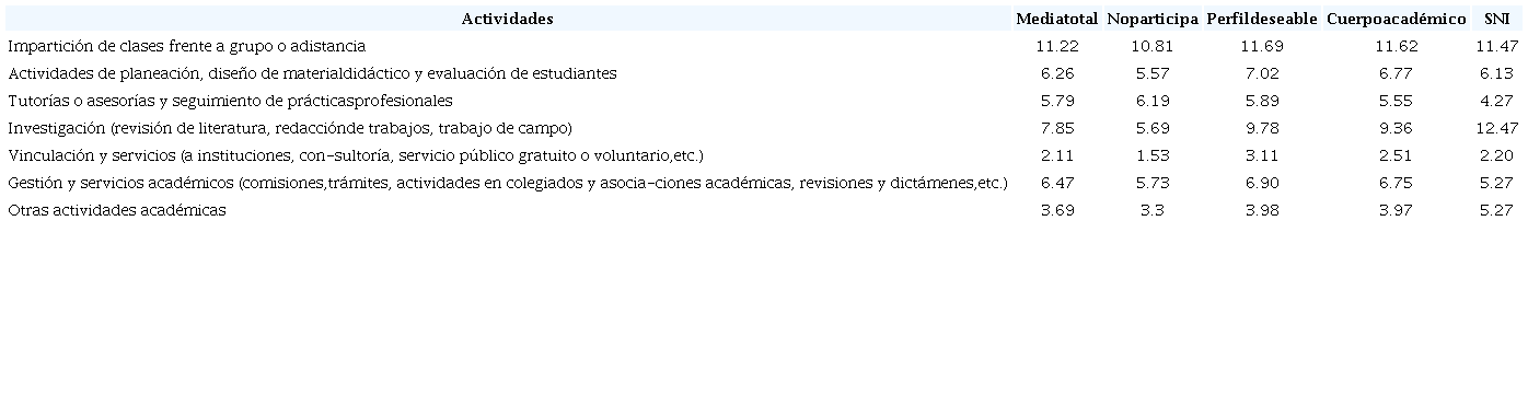 Las actividades relacionadas con docencia suman en promedio 23.27 horas a la semana, mientras que para actividades de investigación se destinan 7.85 horas. Es importante reconocer que las condiciones de cada participante e institución varían en función de sus objetivos y necesidades, por lo que cada contexto exige diferentes niveles de dedicación a las diversas actividades. En este sentido, para comparar el tiempo de dedicación a las actividades se plantea que existe diferencia entre la cantidad de horas dedicadas a las diferentes actividades en los académicos normalistas que participan en los programas de estímulo y reconocimiento, y los que no participan (Tabla 3).