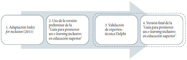 Basado en la experiencia de la primera autora de este trabajo como tutora y coordinadora de las experiencias de e-learning inclusivo en educación superior, y como observadora participante en este proceso, se consideró necesario crear una cierta distancia crítica para analizar el progreso realizado en el desarrollo de una Guía apropiada. Con esto, el propósito del presente estudio se focaliza en una comprensión más holística de los aspectos que deben incluirse en la Guía a través de la síntesis de las opiniones de un grupo de expertos externo. Estos expertos del ámbito de la inclusión, el e-learning y la educación superior fueron invitados para actuar como “amigos críticos” (Ainscow et al., 2012) que discuten sobre el borrador inicial del instrumento. El marco general del proceso que se utilizó para llevar a cabo este análisis se resume en la Fig. 2.