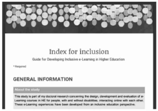 Como resultado de esta experiencia, los autores de este artículo decidieron adaptar la versión existente del Index for inclusion al contexto español, a una modalidad de educación a distancia y a una población adulta que recibe educación superior, para su validación en la Universidad de Manchester en relación con cuatro factores:
