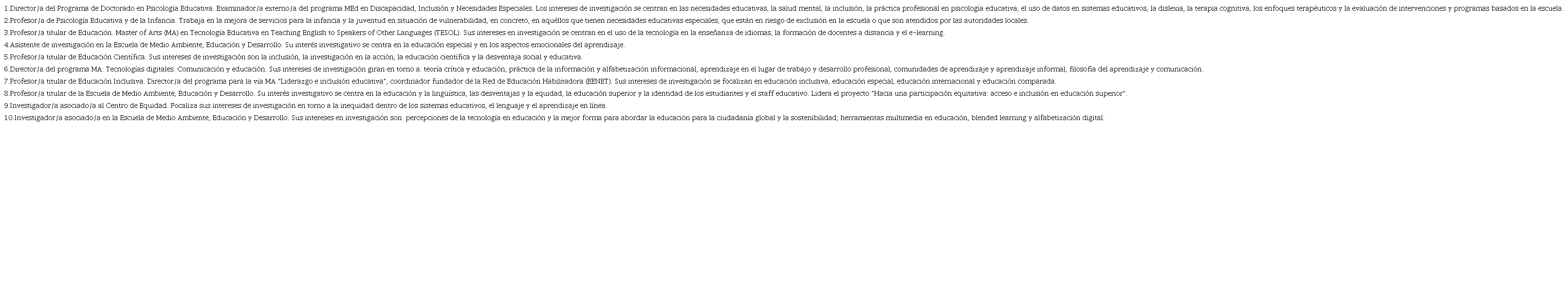 La muestra de este estudio incluye a 10 expertos y expertas de la Universidad de Manchester, seleccionados por su variada y reconocida experiencia a nivel internacional sobre la educación inclusiva, el e-learning y la educación superior. El tamaño de la muestra se considera óptimo para obtener suficiente información de alta calidad y experiencia diversa, controlando los desafíos logísticos del estudio. El objetivo se focaliza en abordar diferentes perspectivas que se resumen en el Cuadro 1.