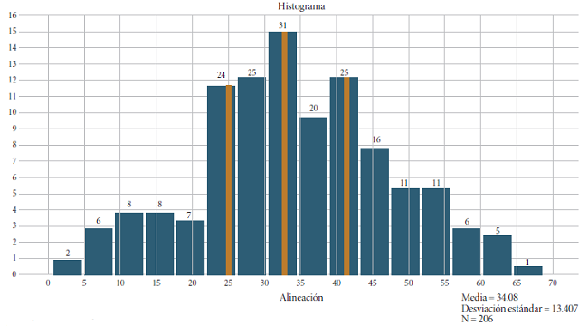 En la Gráfica 1 se presenta el histograma de frecuencias de la variable alineación para los 206 planes de área analizados. Encima de cada barra se indica la cantidad de planes de área que tiene un nivel de alineación dentro del intervalo correspondiente. Se señala con líneas blancas verticales el primer cuartil, el valor de la media y el tercer cuartil. La prueba de Kolmogorov-Smirnov nos permite afirmar, con un nivel de confianza de 95 por ciento, que los datos muestrales siguen una distribución normal.