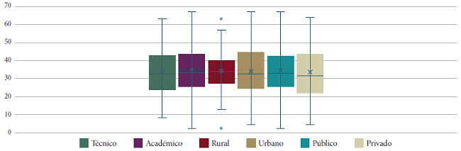 A continuación, se presenta el análisis de la alineación de los planes de área con los estándares de acuerdo con tres categorías: área geográfica (rural y urbano), tipo de institución (público y privado) y modalidad de educación media (académico y técnico). En la Gráfica 2 se presentan los gráficos de cajas para las seis variables de estas tres categorías. Como se observa, las medianas de las seis variables son muy parecidas, así como su dispersión (excepto para el estrato rural). En la variable rural encontramos dos datos distantes que analizaremos más adelante.