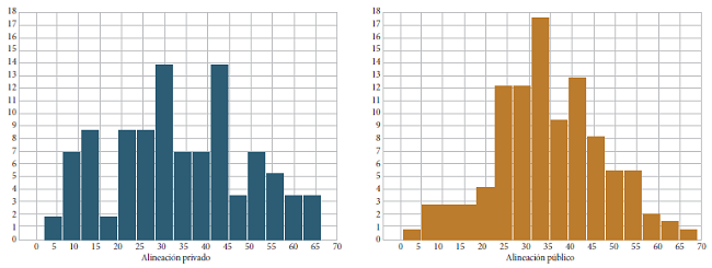 La alineación por tipo de institución permite realizar la comparación entre las instituciones públicas y privadas. En la Gráfica 3 se presentan los histogramas de frecuencias para la variable alineación para las dos submuestras de este estrato. La Tabla 1 completa la información gráfica con tres estadísticos para las dos muestras de este estrato. La media de alineación de las instituciones educativas privadas es de =33.66 por ciento, mientras que la media de las instituciones educativas públicas es =34.25 por ciento.