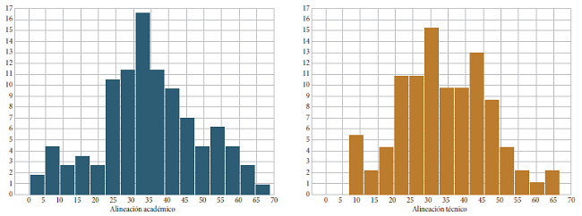 Al realizar la comparación entre las instituciones con modalidad académica y técnica encontramos que la media de alineación de las instituciones educativas académicas es de =34.41 por ciento, mientras que la media de las instituciones educativas técnicas es =33.67 por ciento y sus desviaciones son 14.13 y 12.51 por ciento respectivamente. En la Gráfica 4 se presentan los histogramas para las dos variables de este estrato.