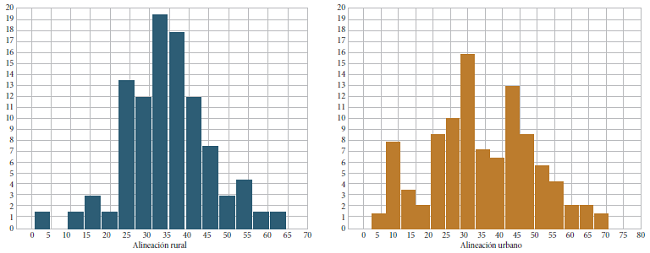 Finalmente, se analizó la alineación con los estándares entre las instituciones rurales y urbanas. En la Gráfica 5 se presentan los histogramas para la variable alineación en las submuestras de este estrato.