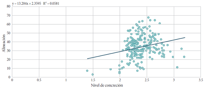En la Gráfica 6 se presenta el diagrama de dispersión de estas dos variables. El valor de r2=0.0581 indica que 5.81 por ciento de la variación de la alineación con los estándares puede explicarse por el nivel de concreción. Además, teniendo en cuenta la ecuación de la recta de regresión y=13.20x + 2.36, interpretamos que por cada aumento de una unidad en el nivel de concreción hay un aumento de 13.2 por ciento de alineación de los planes de área con los estándares.