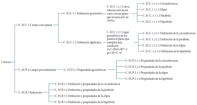 La codificación de los planes de área se realizó a partir de los códigos que se obtuvieron al hacer el análisis de contenido de cada uno de los temas elegidos (Cañadas et al., 2018). Nos centramos en la dimensión conceptual del currículo y en el concepto pedagógico “estructura conceptual”. Con base en este concepto pedagógico fue posible identificar los conceptos, los procedimientos y las relaciones entre conceptos y procedimientos de un tema de las matemáticas escolares. Así, construimos unos árboles de códigos para cada tema.1 Por ejemplo, en la Fig. 1 se presenta una parte del árbol de códigos para la estructura conceptual de las cónicas.