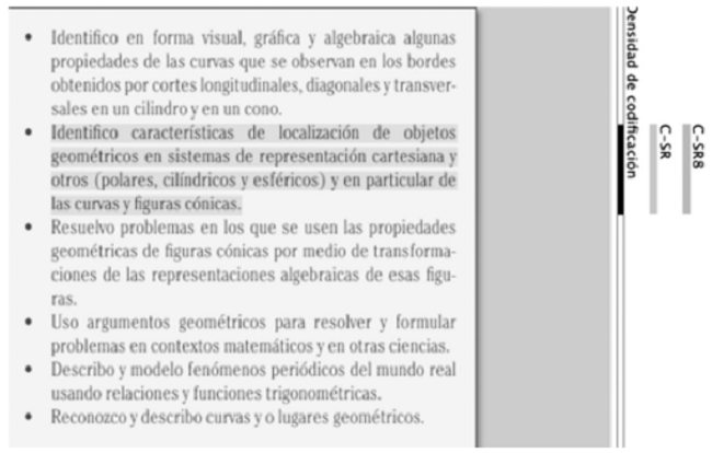 El proceso de codificación consistió en asignar un código del árbol de códigos a cada segmento de texto del tema que aborda ese aspecto del contenido correspondiente. En la Fig. 2 se presenta la codificación de unos de los estándares. En este segmento de texto se identificaron los sistemas de presentación de las secciones cónicas y se le asignó el código C-SR8. La etiqueta C-SR8 significa que el código corresponde al tema de cónicas (C), hace referencia a los sistemas de representación (SR) y la representación cartesiana que tiene el código (8) de esa rama del árbol de códigos. Cabe anotar que el programa en el que se codificaron los planes de área asigna automáticamente los códigos de las ramas anteriores al código que se utilizó, como se observa en las barras verticales de la Fig. 2.