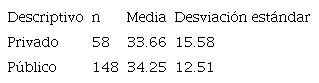 Con un nivel de confianza de 95 por ciento no es posible rechazar la hipótesis nula de igualdad en medias con un p-valor de 0.80; sin embargo, la hipótesis nula de igualdad de desviaciones estándar debe ser rechazada con un p-valor de 0.018 para las instituciones educativas públicas y privadas.